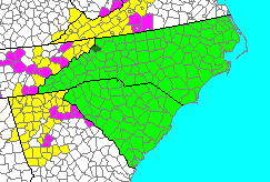 | Green counties indicate a completed state. Yellow marks my other county highpoints. Pink indicates counties on my wish list. Dark green is my home county, Watauga. |